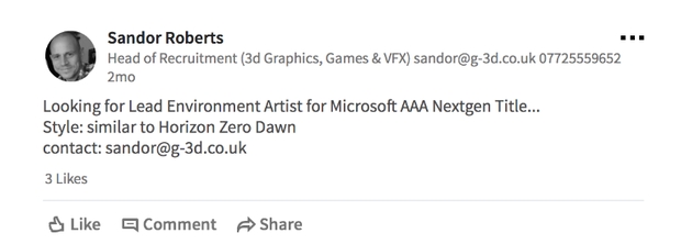 En effet, le profil LinkedIn de Sandor Roberts, chef de recrutement pour les gros studios, nous informait il y a deux mois qu’il recherchait un « Lead Environment Artist pour un triple A Microsoft Next-Gen » qui est, je cite « Similaire à Horizon Zero Dawn« ! Et oui les aventures d’Aloy développées par Guerrilla Games ont tapé dans l’oeil de Microsoft, qui entend bien réaliser un soft du même style, pour le plus grand bonheur des fans!