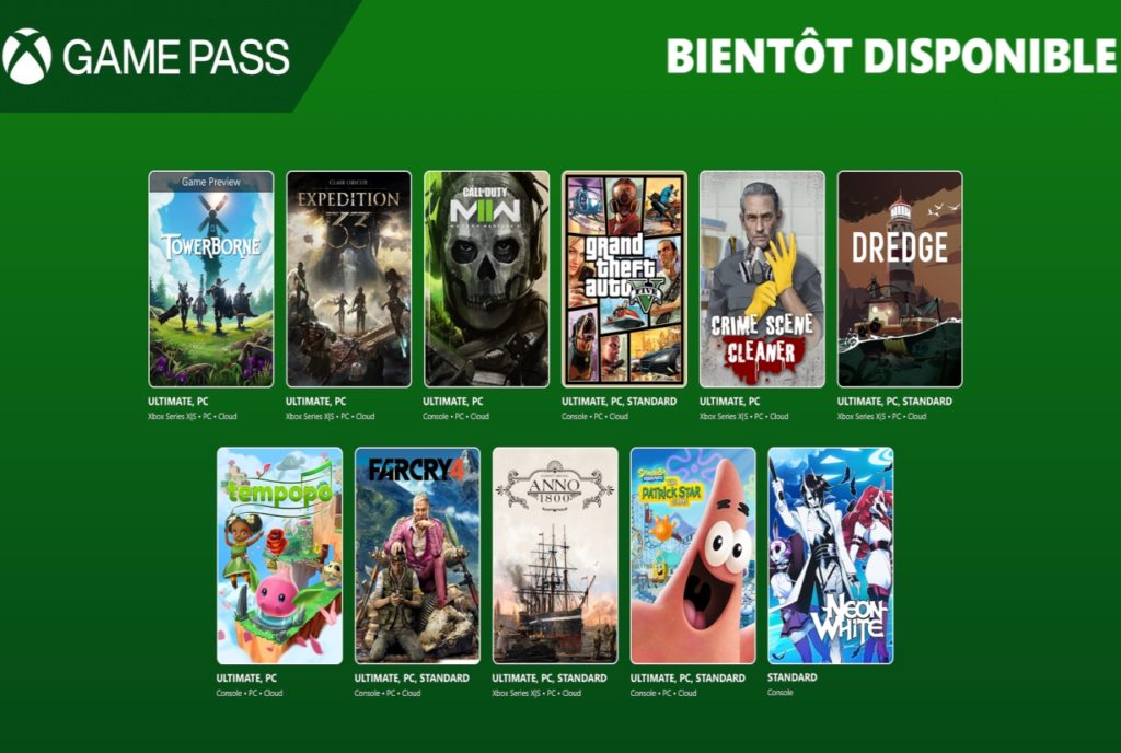 - Clair Obscur: Expedition 33 (Cloud, PC et Xbox Series X|S) : Game Pass Ultimate et PC Game Pass