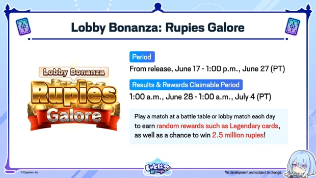 Lobby Bonanza : Rupies Galore se tiendra dès la mise en ligne du jeu jusqu’au 27 juin à 23h (heure FR). Terminez la quête quotidienne dans Shadowverse Park pour gagner chaque jour un coffre Rupies Galore.