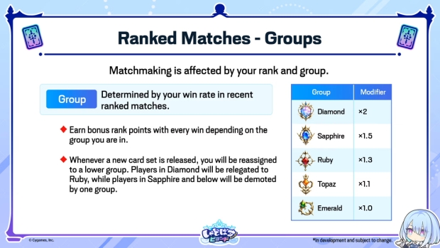 Les groupes sont une nouvelle fonctionnalité de Shadowverse: Worlds Beyond, déterminée par le taux de victoires récent des joueurs et qui fluctue au fil du temps. Les joueurs commencent dans le groupe « Emerald », puis progressent dans les groupes « Topaz », « Ruby », Sapphire », puis « Diamond » à mesure que leur taux de victoires s’améliore. Cependant, ces groupes sont partiellement réinitialisés à chaque saison.