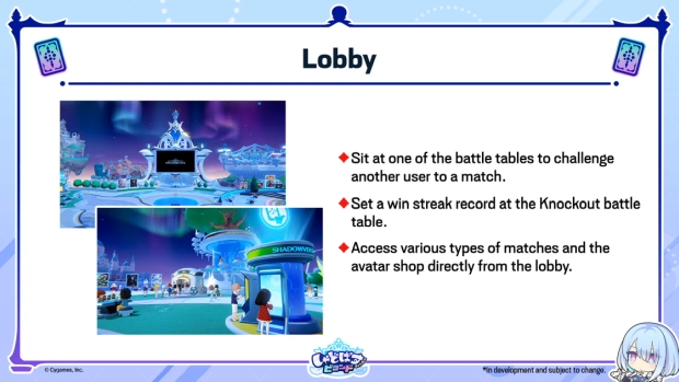 En plus des combats, les joueurs peuvent utiliser leur avatar personnalisable dans le lobby pour communiquer avec d’autres joueurs du monde entier via des messages instantanés, des gestes et des stickers.
