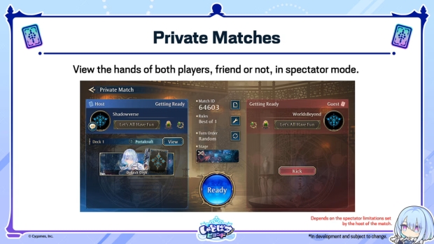 Les matchs privés génèrent des identifiants que les joueurs peuvent partager à des adversaires spécifiques afin de les affronter. Les joueurs peuvent également assister au match en utilisant le même identifiant. Dans Shadowverse: Worlds Beyond, l’hôte d’un match privé peut aussi autoriser les spectateurs à voir les mains des deux joueurs, même si ces derniers ne figurent pas dans leur liste d’amis.