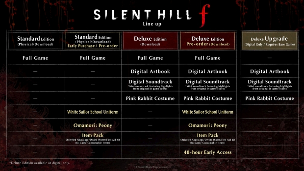 Les éditions numériques « Standard » et « Deluxe » de SILENT HILL f octroient des bonus numériques dont des tenues, des morceaux de la bande-son, un artbook et un accès anticipé de 48 heures. L’édition numérique « Standard » est disponible en précommande, tout comme l’édition physique « Day One », et ces deux versions comprennent des bonus de précommande. L’édition « Deluxe » est disponible uniquement en format numérique, et les joueurs auront la possibilité d’acquérir une mise à niveau « Deluxe » après le lancement afin de profiter des bonus de l’édition « Deluxe ».