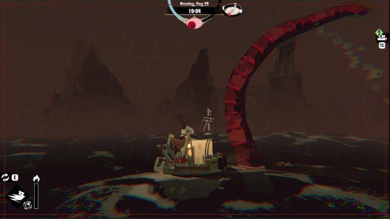 En dehors de la poiscaille justement, il faudra aussi ramasser du matériel et des artefacts, témoins des navires échoués sur les côtes de cet archipel étrange. Le but ? Améliorer votre chalutier, l’agrandir, disposer de plus d’emplacements pour vos cannes et filets, vos moteurs ou encore vos lumières, vitales lorsque vous vous aventurez en mer passée 18h. Vous devrez aussi rapidement prendre conscience que votre navire a une capacité de stockage limité et qu’il faudra littéralement jouer à Tetris pour tout y faire rentrer et optimiser vos sorties ! C’est fun et ça nous rappelle avec nostalgie la grande époque des inventaires de RPG bien old school.