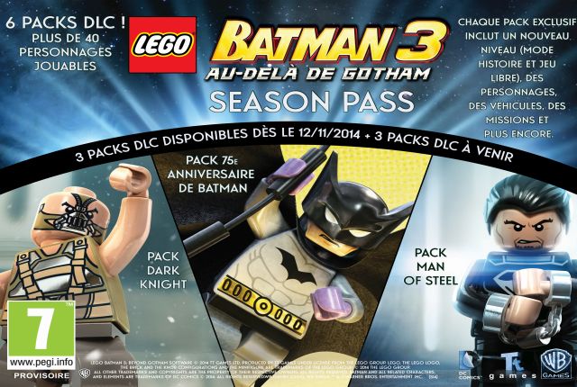 Aujourd’hui, Warner Bros. Interactive Entertainment a annoncé un Season Pass téléchargeable pour LEGO Batman 3: Au-delà de Gotham, le premier Season Pass pour un jeu vidéo LEGO. Le Season Pass comprendra 6 Packs de contenu téléchargeable, chacun proposant un nouveau niveau (mode Histoire et Jeu Libre) avec un thème unique. Les joueurs pourront débloquer plus de 40 personnages au total, ainsi que des véhicules, des missions et bien plus. Les trois premiers packs de contenu téléchargeable seront disponibles le 11 novembre et les trois autres seront annoncés plus tard. Le Season Pass sera disponible sur PS4, Xbox One, Xbox 360, PS3 et sur PC pour la somme de 13.99€.