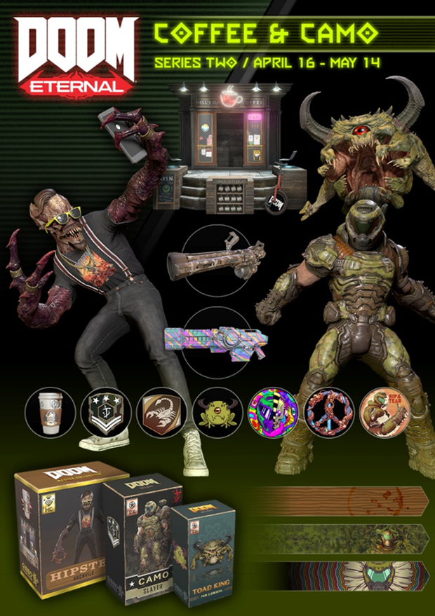 Aujourd’hui marque le début d’une toute nouvelle série dans DOOM Eternal ! Avec l’arrivée de la Série 2, intitulée CAFÉ ET CAMOUFLAGE, les joueurs pourront mettre la main sur toute une collection d’objets cosmétiques à débloquer.