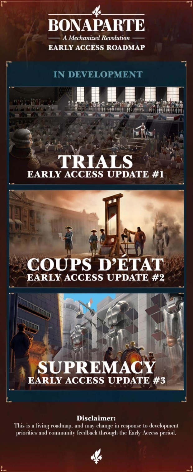 Tout au long de son Accès Anticipé, Bonaparte – A Mechanized Revolution bénéficiera de nombreuses mises à jour de contenu qui ajouteront de nouvelles possibilités de jeu comme des procès politiques ou des événements déterminants, mais aussi du nouveau contenu tactique. La feuille de route est disponible ci-dessous :