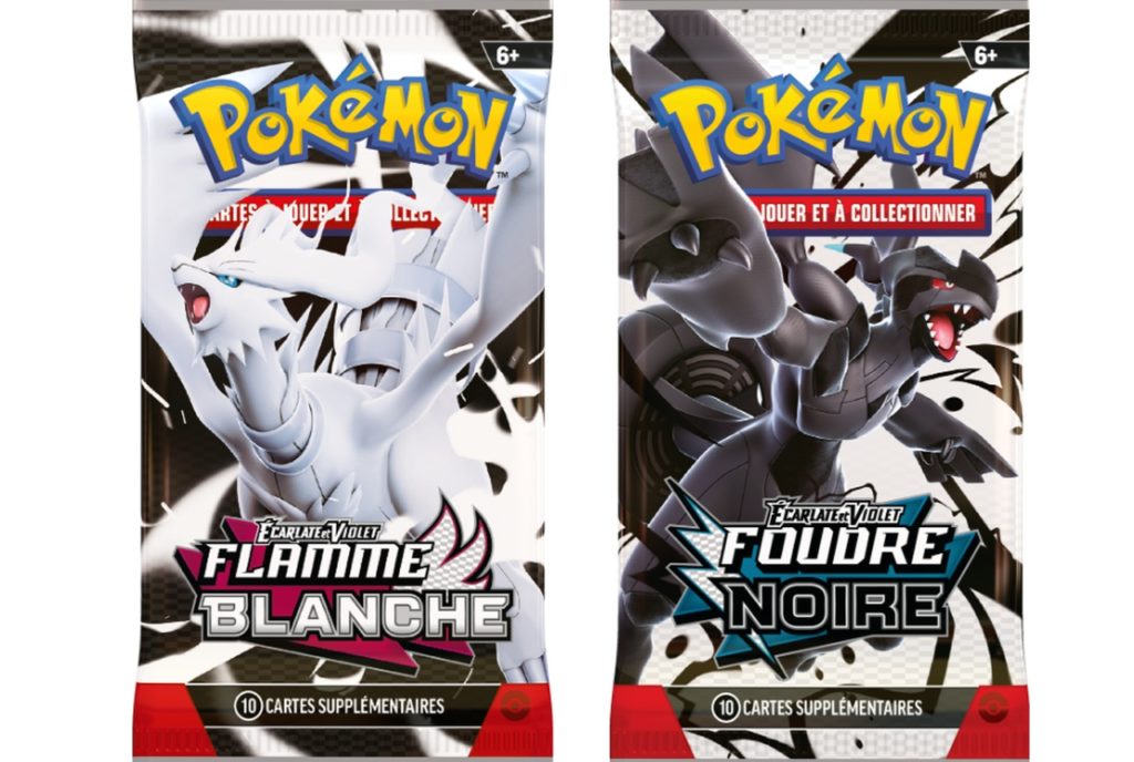 - Collection classeur Écarlate et Violet – Foudre Noire ou Écarlate et Violet – Flamme Blanche (disponible le 18 juillet 2025) contenant respectivement : 5 boosters Écarlate et Violet – Foudre Noire ou Écarlate et Violet – Flamme Blanche ; et 1 album avec 9 pochettes par page présentant Zekrom ou Reshiram, pour organiser et garder les cartes du JCC Pokémon.