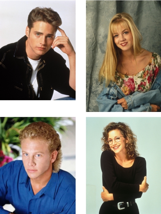 Jason Priestley incarnait Brandon Walsh, le jeune homme idéaliste fraîchement arrivé à Beverly Hills avec sa sœur. Jennie Garth interprétait Kelly Taylor, figure incontournable de la série, aussi charismatique que complexe. Ian Ziering jouait Steve Sanders, le fêtard attachant au grand cœur, et Gabrielle Carteris donnait vie à Andrea Zuckerman, brillante élève et rédactrice engagée du journal du lycée.