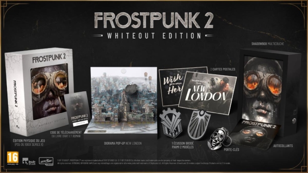 - Frostpunk 2: Whiteout Edition enrichit encore davantage l’offre en regroupant tous les contenus Icebreaker dans une shadowbox à plusieurs couches doté d’un éclairage LED intégré et d’illustrations emblématiques. Elle comprend également une mise à niveau vers l’édition Deluxe, qui donne accès aux trois prochains DLC, ainsi que des souvenirs physiques : un porte-clés de luxe en métal et émail, deux cartes postales artistiques premium de Nouvelle Londres, des autocollants sur le thème de Frostpunk et l’un des deux écussons brodés possibles, soit celui des Technocrates disciplinés, soit celui des fervents Sangivres.