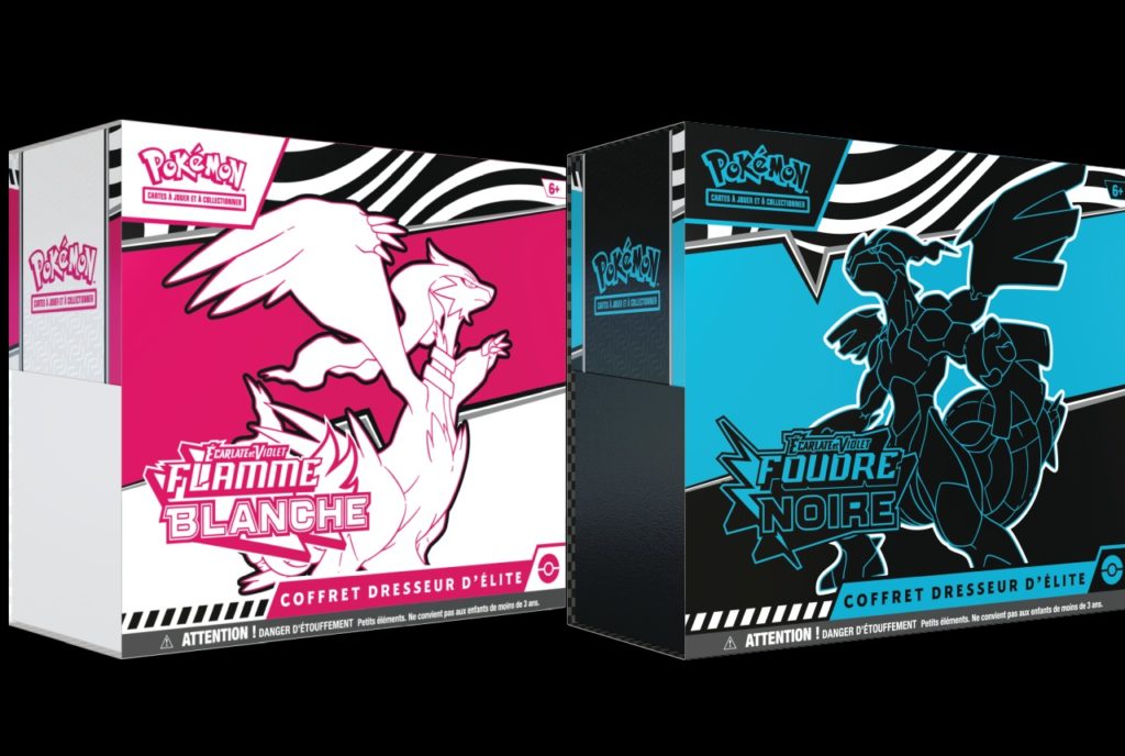 - le Coffret Dresseur d’élite Écarlate et Violet – Foudre Noire ou Écarlate et Violet – Flamme Blanche, contenant neuf boosters Écarlate et Violet – Foudre Noire ou Écarlate et Violet – Flamme Blanche respectivement, une carte promo au style « illustration rare » de Fulguris ou Boréas et des accessoires de jeu divers ;