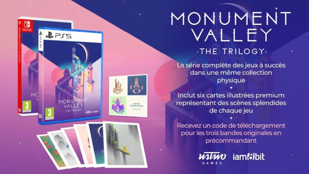 Disponible pour Playstation 5 et Nintendo Switch dès le 30 octobre 2025, cette sortie inclura en bonus dans la boîte un ensemble de six carte illustrées représentant le monde coloré des jeux Monument Valley. De plus, le premier tirage du jeu (« day one ») contiendra en supplément un code de téléchargement pour l’ensemble des bandes-son éthérées de ces trois jeux.