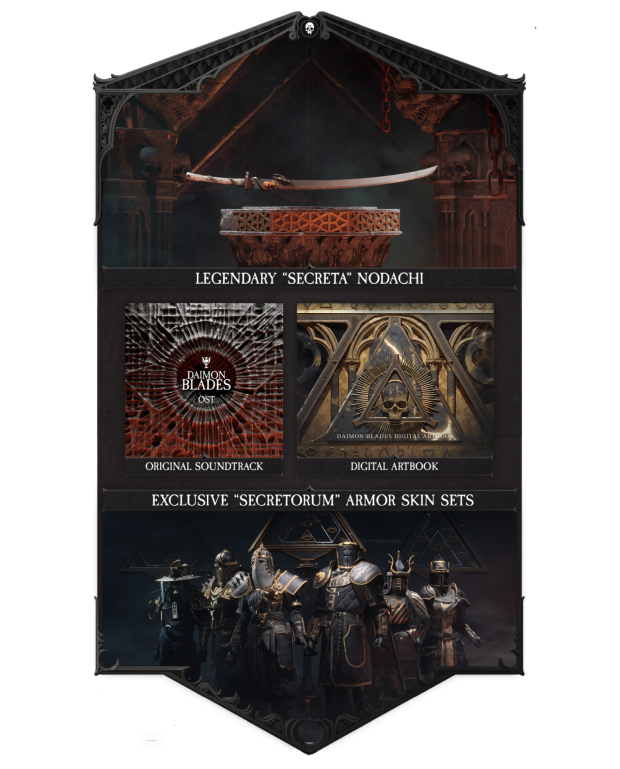 Celles et ceux qui tenteront leur chance durant l’Accès Anticipé de Daimon Blades seront récompensés avec le bundle Secreta Secretorum, qui inclut deux skins – une arme et une armure – qui rendent hommage au titre originel de Streumon, E.Y.E: Divine Cybermancy. Un artbook au format numérique (PDF) et la bande originale (en MP3 et formats lossless) complètent le tout. Si ces deux derniers bonus seront disponibles à l’achat lors de la sortie de la version 1.0, les deux skins resteront éternellement exclusifs à l’Accès Anticipé.
