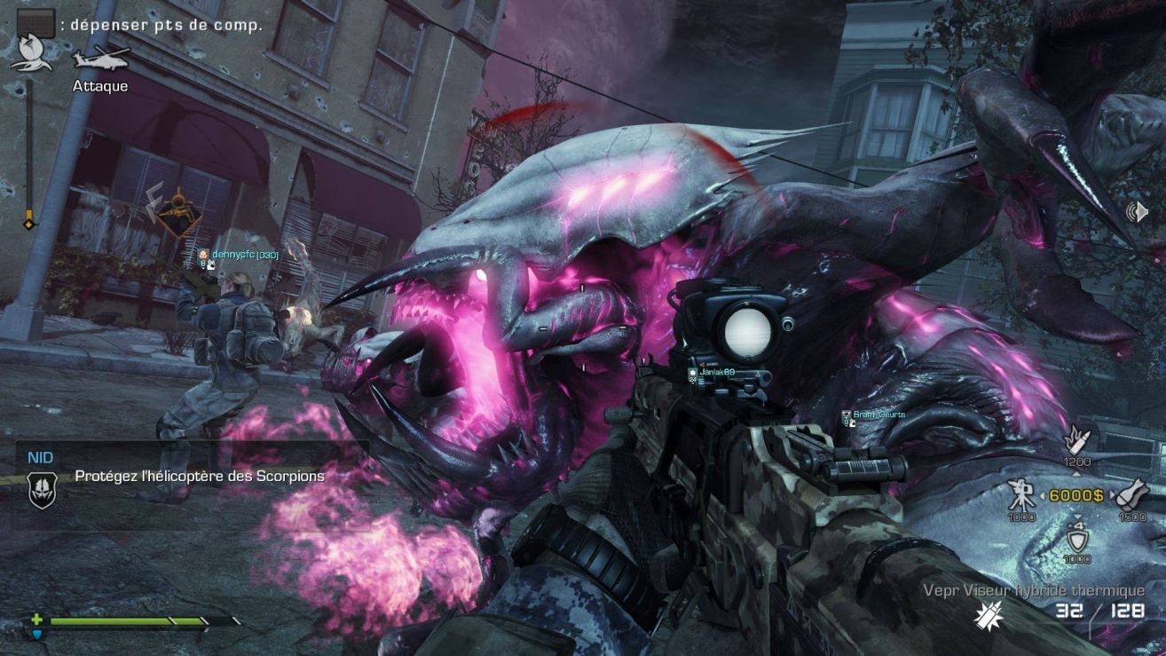 En effet, ce Call of Duty : Ghosts crée la surprise avec un mode de jeu absolument bluffant : Extinction ! Dans des décors aux teintes rosâtres, vous allez devoir, seul ou jusqu’à quatre, accomplir des missions pour pulvériser des nids d’aliens en utilisant notamment une foreuse automatique ou carrément un hélicoptère. Au début, vous devez choisir un pistolet, 4 capacités et une amélioration. A chaque objectif, il y a un défi à réaliser qui donne droit, une fois réussi, à un point de compétence permettant d’augmenter l’une de vos capacités. En tuant des monstres ou simplement en accomplissant des missions simples, vous gagnerez de l’argent qui vous servira à acheter de meilleures armes, à utiliser vos compétences ou à activer des pièges. Enfin, en fouillant les détritus disséminés dans le niveau, vous pourrez obtenir des accessoires pour vos armes ou d’autres équipements. Un mode totalement chronophage!