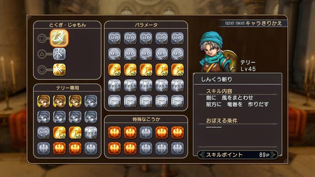 Enfin, ascendance jeu de rôle oblige, le titre vous propose une base d’opération, l’Aéroc, qui contient tout ce qu’un bon village RPG peut héberger : une boutique d’armes, une autre pour les armures (ici remplacées par des orbes), un bureau de quêtes annexes, un crafteur pour concevoir vos propres objets via des recettes, un bureau des distinctions qui vous récompense de mini-médailles pour vos hauts faits, un échangeur de mini-médailles contre des items rares, et surtout la cultissime église typique de Dragon Quest, histoire de sauvegarder votre partie avec les mêmes bruitages 8bits qu’à l’époque. On termine cet aspect « rôliste » par des héros qui montent de niveau au fur et à mesure de leurs combats, ce qui vous permettra de répartir des points de compétence dans des boosts de HP, de MP, de sagesse ou encore de vitalité, mais aussi d’augmenter la puissance de vos coups spéciaux ou encore de vos parades. Idéal pour personnaliser au mieux votre fine équipe.